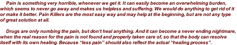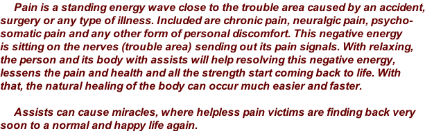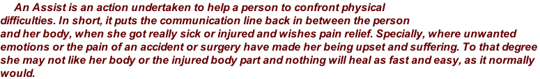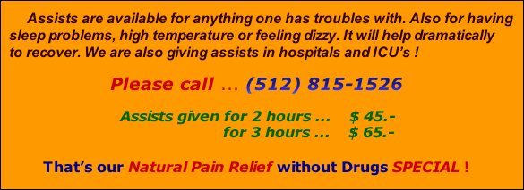 If you have pain and need urgently help, please call ... Please read the article below, so you can  get a better viewpoint  and understanding of it. Injuries, surgeries, delivery of babies, severe illnesses and periods of intense emotional shock all deserve to be handled with thorough and complete assists. What is Pain What is an Assist Medical examination and diagnosis should be sought where ever needed. Also where medical treatment is routinely successful, it should be obtained regularly. An assist is not a substitute for medical treatment, (512) 815-1526 The Solution is Pain Relief without Drugs ! An assist does not intrude in any way the role of medicine.